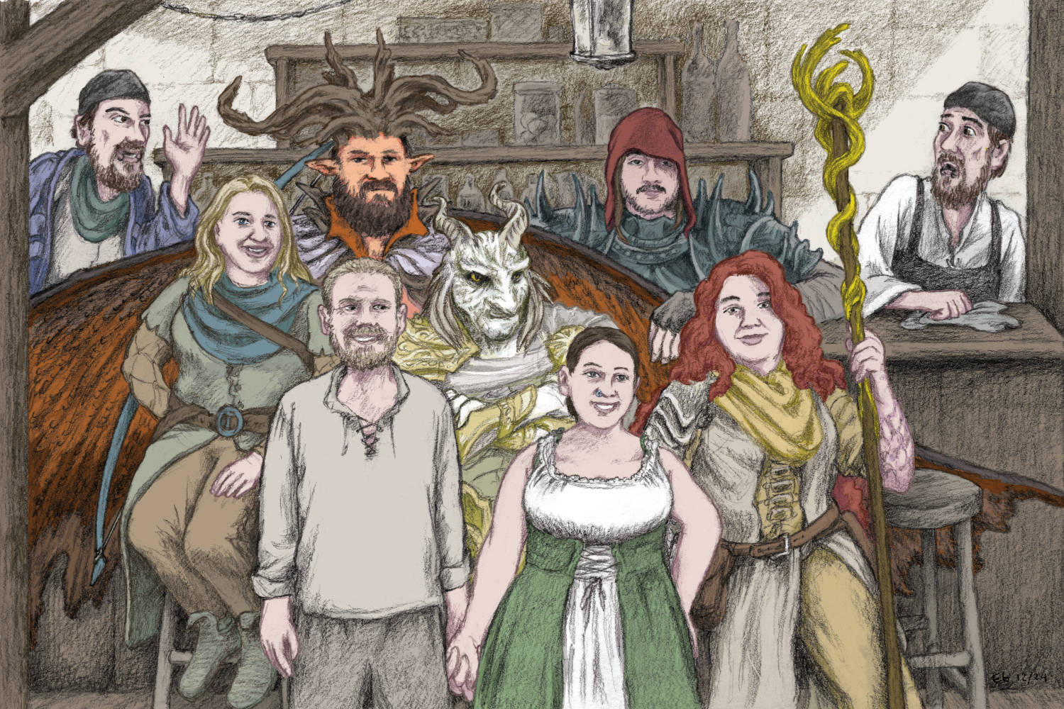 Commissioned portrait of a Dungeons & Dragons party, based on photos of the real people and figurines of their characters. The guy at the left is a shapeshifter who's messing with the bartender.