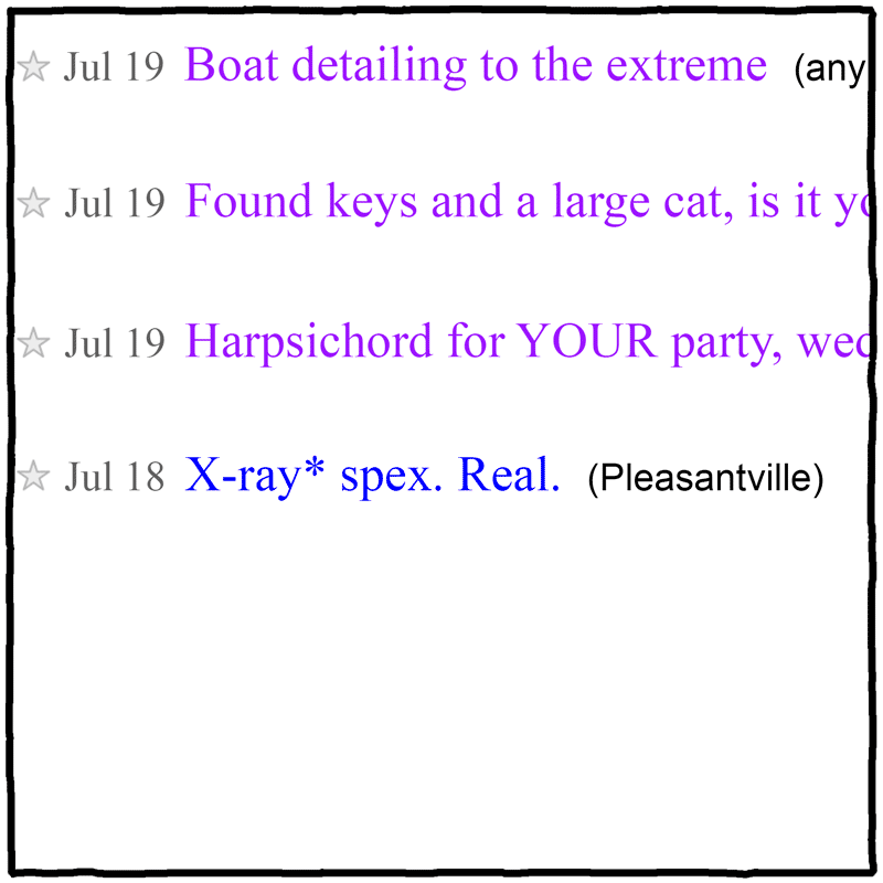 A list of online classified ads. The last one says 'X-Ray Spex. Real.' Ad close-up: X-Ray Spex. Real. Send $5 to 991 Lost Lane, Pleasantville. Please follow all safety instructions.